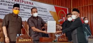 Ungkapan tersebut disampaikan secara langsung Bupati Kotabaru H Sayed Jafar pada pidato penyampaian satu buah Raperda tentang pertanggungjawaban pelaksanaan Anggaran Pendapatan Belanja Daerah (APBD) tahun anggaran 2020 dalam rapat paripurna Dewan Perwakilan Rakyat Daerah (DPRD) Kotabaru dalam persidangan III rapat ke 7, Senin (14/6/2021).
