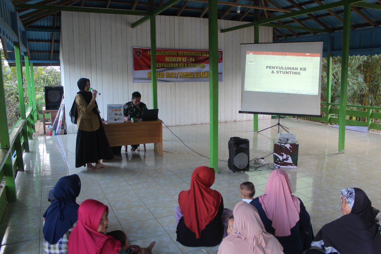 Salah satunya melakukan penyuluhan tentang Keluarga Berencana (KB) dan Stunting yang digelar oleh para Satgas TMMD Kodim Tanbu di Aula Kantor desa Sumber Arum Kecamatan Satui, Senin (15/08/2022).