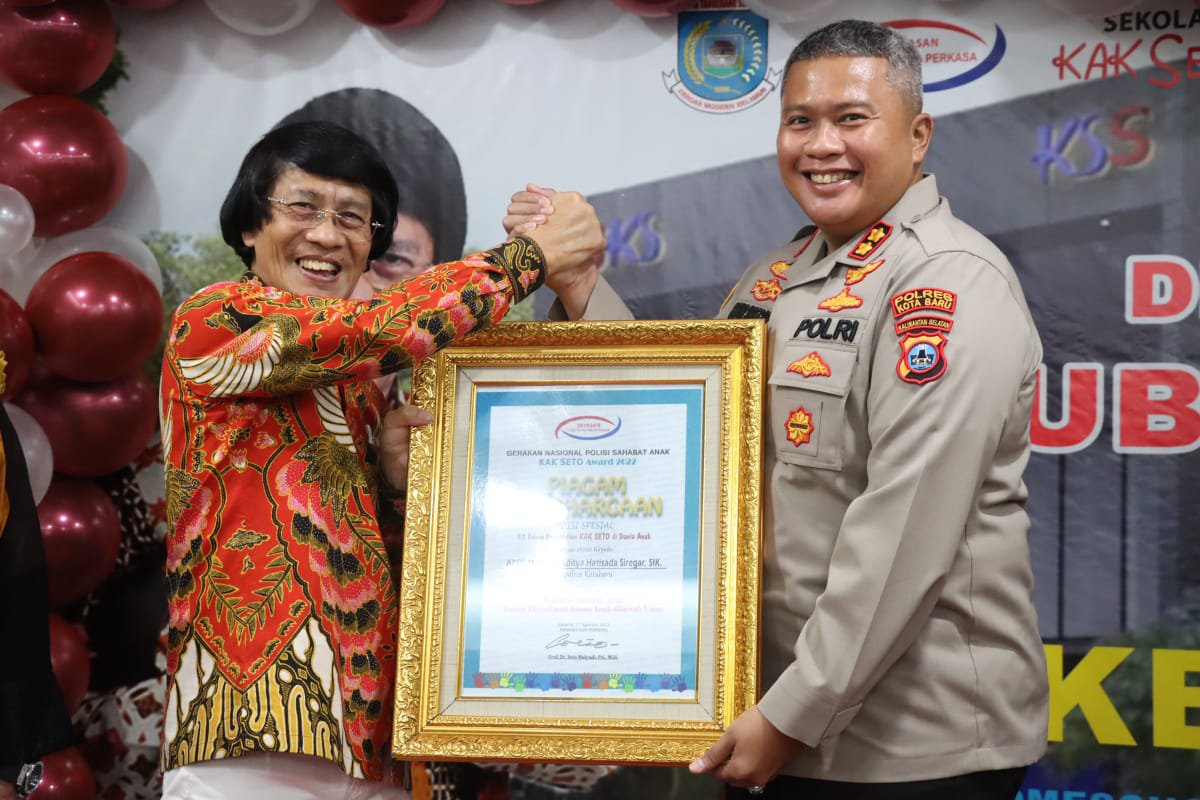 Kapolres Kotabaru menerima langsung penghargaan tersebut dari Prof. Dr. H. Seto Mulyadi, S.Psi., M.Si (Kak Seto) dan Dr. Hj. Titik Prastyowati Verdi, SH., MH selaku anggota DPR RI Komisi X, di Home Scholing Kak Seto Jakarta, Minggu (28/08/22).