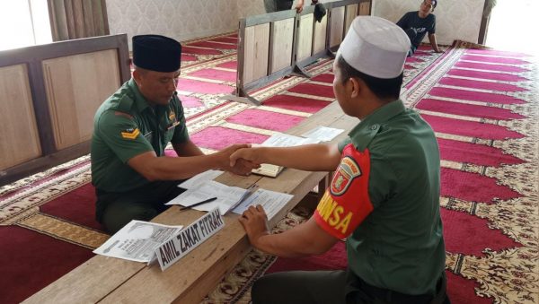 Ramadhan 1444 H telah sampai di penghujung bulan, Anggota Kodim 1022/Tnb melaksanakan kewajibannya dengan membayar Zakat Fitrah di Mushola Makodim jalan Kodeco Km 4,5 desa Sarigadung Kecamatan Simpang Empat, Senin (17/04/2023).