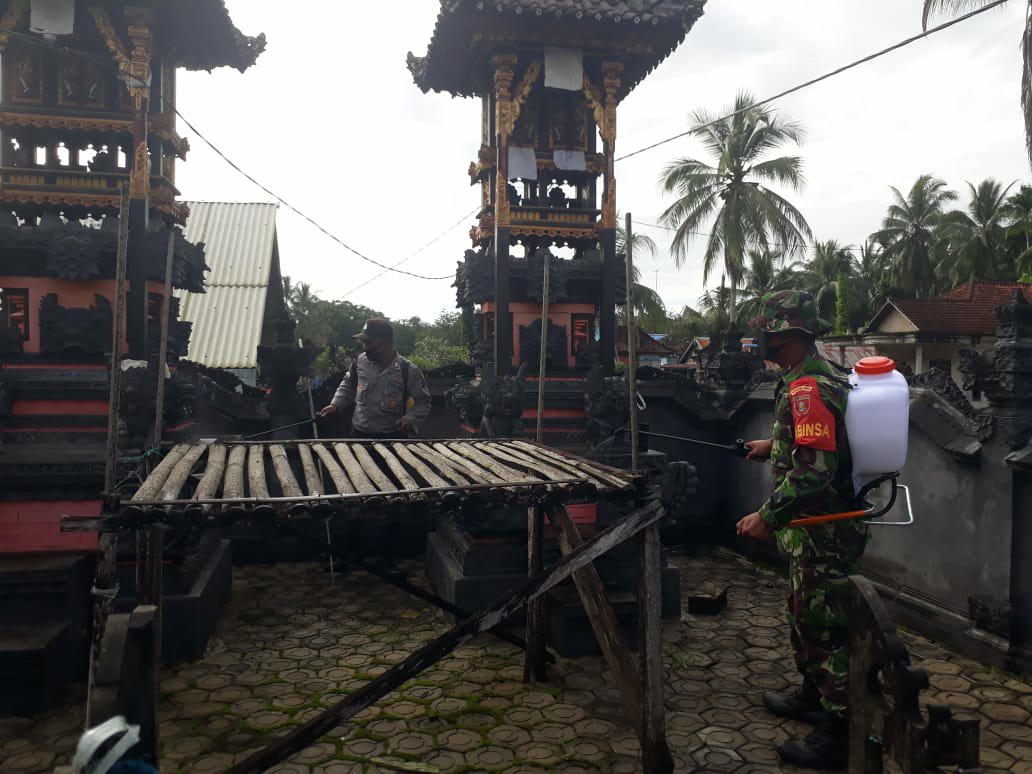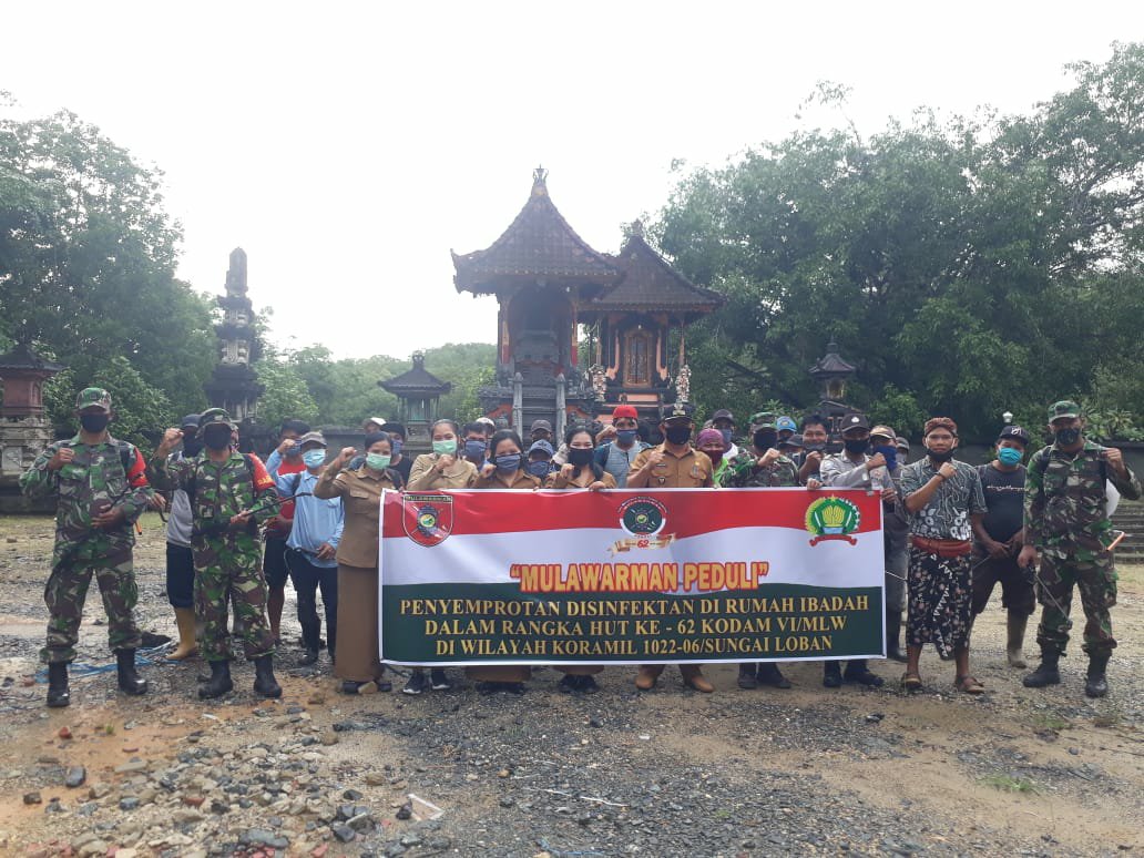 Kabarbanua.com,Tanah Bumbu- Dalam rangka Karya Bakti HUT ke-62 Kodam VI/Mulawarman, Koramil 1022-06/Sungai Loban bersama anggota menggelar penyemprotan disinfektan di pura PED dan pura puseh di Desa Kertabuwana, Kecamatan Sungai Loban Selasa (14/7/2020) dengan tema ‘ MULAWARMAN PEDULI”.