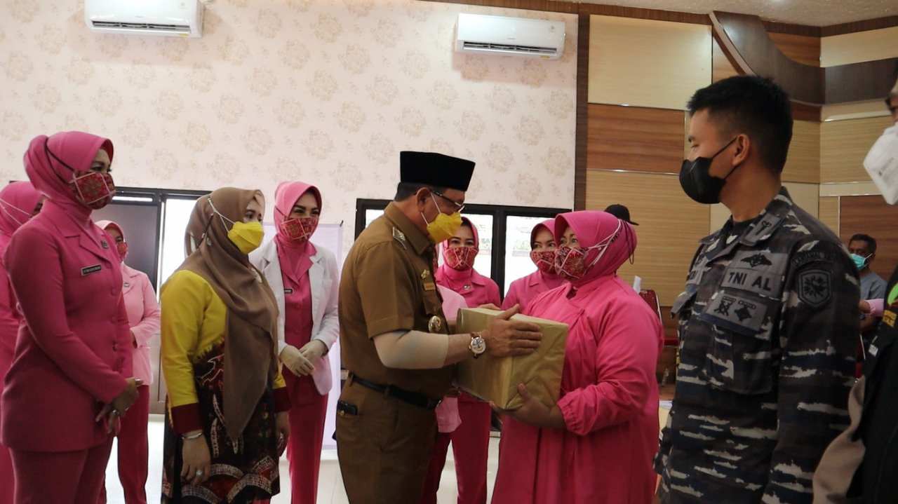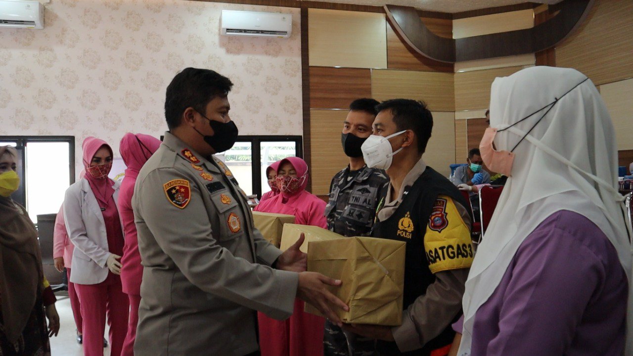 Bupati Kotabaru H Sayed Jafar Alaydrus, SH. didampingi Kapolres Kotabaru Akbp M Gafur Asitya Siregar, Sik meninjau pelaksanaan Gebyar Vaksin Presisi Polres Kotabaru dan menyerahkan bingkisan kepada Tim vaksinator.