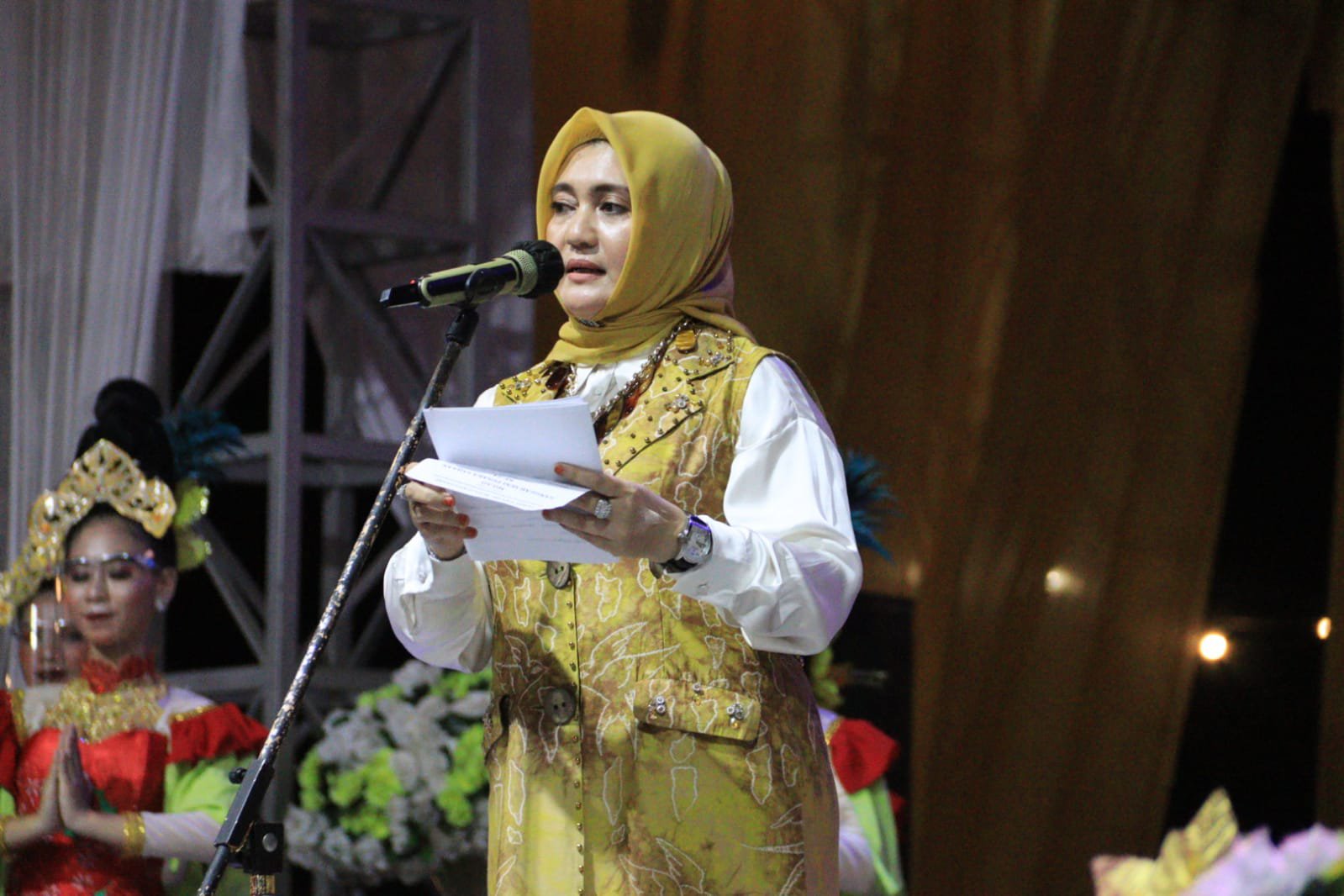 Dalam sambutannya Hj.Fatma Idiana mengucapkan terima kasih dan penghargaan yang tinggi kepada sanggar Seni Pusaka Saija’an yang telah menyelenggarakan acara syukuran dan pagelaran seni.