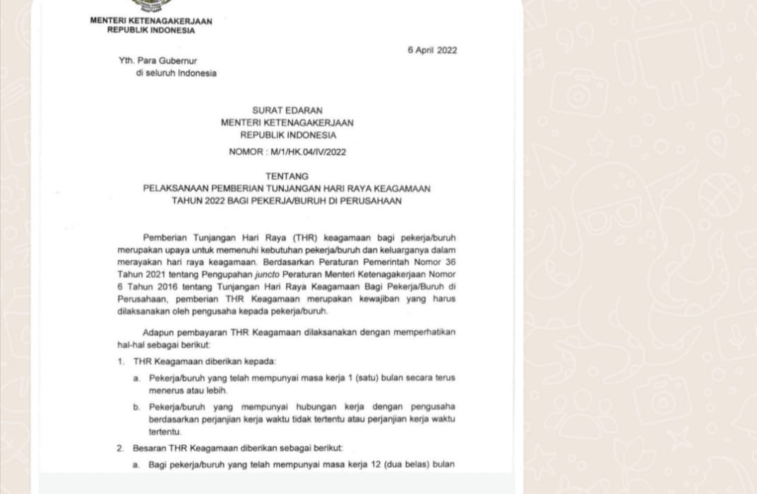 Kabarbanua.com, Kotabaru- Melalui Menteri Ketenagakerjaan Ida Fauziyah telah mengeluarkan Surat Edaran (SE) Nomor M/1/HK.04/IV/2022 tanggal 6 April 2022 menetapkan Pelaksanaan Pemberian Tunjangan Hari Raya (THR) Keagamaan Tahun 2022 bagi pekerja/buruh di perusahaan.