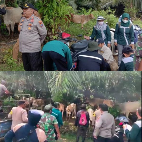 Kabarbanua.com, Kotabaru- Cegah PMK, Kapolsek Pulau Laut Timur Iptu Kuwat Santoso bersama anggota Bhabinkamtibnas desa dampingi dinas terkait melaksanakan vaksinasi hewan ternak sapi masyarakat di perkebunan sawit wilayah Desa Bekambit, Senin (26/09/22).