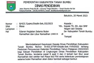 Menjelang Bulan Suci Ramadhan, Disdik Tanbu Keluarkan Surat Edaran, Ini Isinya