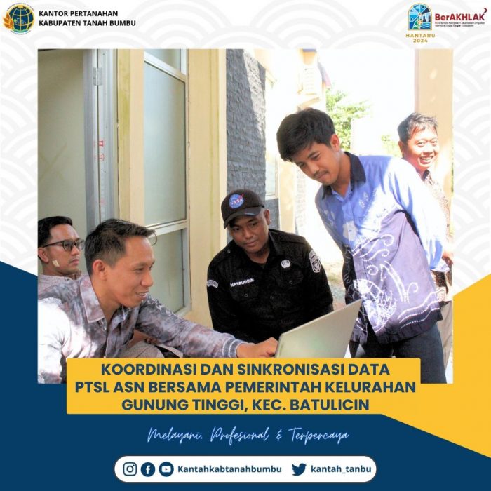 Kabarbanua.com, Tanah Bumbu- Kantor Pertanahan Kabupaten Tanah Bumbu telah melaksanakan Koordinasi dan Sinkronisasi Data PTSL ASN bersama Pemerintah Kelurahan Gunung Tinggi, Kecamatan Batulicin. Kamis tanggal 19 September 2024