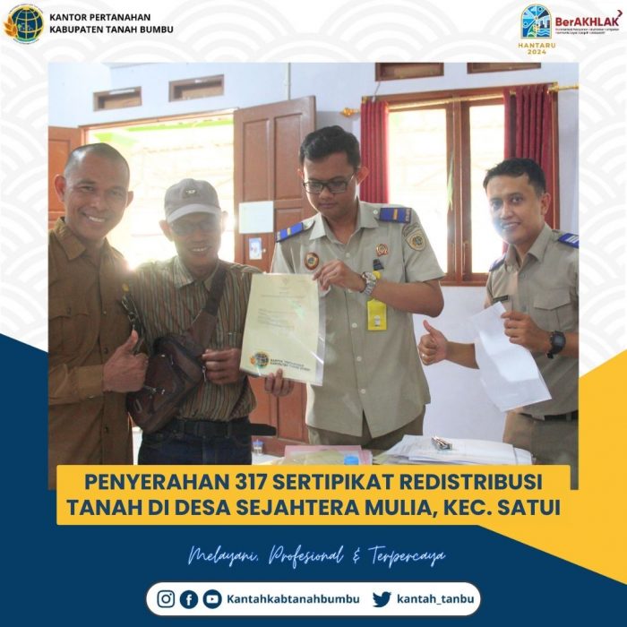 Kabarbanua.com,Tanah Bumbu- Ada sebanyak 317 Sertipikat Reditribusi Tanah diserahkan pihak Kantor Badan Pertanahan Nasional Tanah Tanah Bumbu di Desa Sejahtera Mulia, Kecamatan Satui (Senin, 07/10/2024)