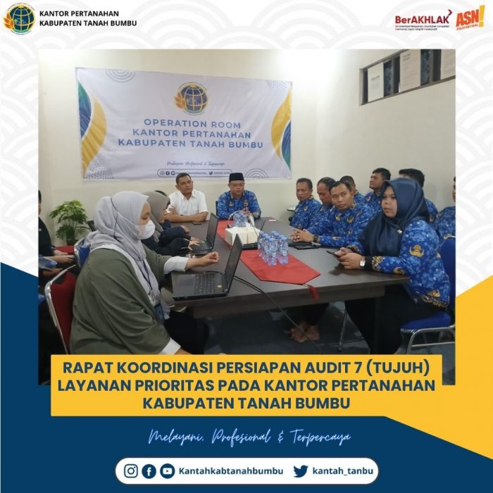Kabarbanua.com,Tanah Bumbu- Kepala Kantor Pertanahan Kabupaten Tanah Bumbu, Isa Widyatmoko, S.SiT., M.A.P. memimpin langsung Rapat Koordinasi Persiapan Audit 7 (tujuh) Layanan Prioritas Tahun 2024 pada Kantor Pertanahan Kabupaten Tanah Bumbu.