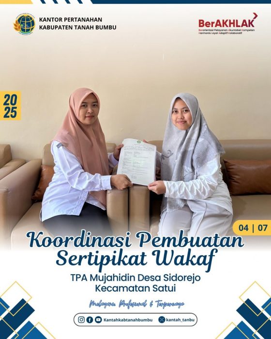 Kabarbanua.com, Tanah Bumbu, 4 Juli 2025 — Dalam rangka mendukung tertib administrasi pertanahan dan perlindungan aset keagamaan, Kantor Pertanahan Kabupaten Tanah Bumbu melaksanakan koordinasi pembuatan Sertipikat Tanah Wakaf untuk Taman Pendidikan Al-Qur’an (TPA) Mujahidin yang berlokasi di Desa Sidorejo, Kecamatan Satui, pada Jumat (04/07/2025).