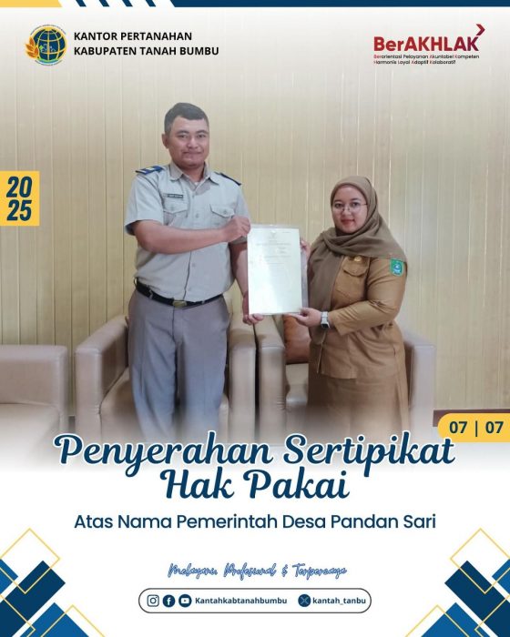 Kabarbanua.com, Tanah Bumbu, 7 Juli 2025 — Dalam upaya mendukung tertib administrasi pertanahan serta memberikan kepastian hukum atas aset-aset milik pemerintah desa, Kantor Pertanahan Kabupaten Tanah Bumbu melaksanakan kegiatan Penyerahan Sertipikat Hak Pakai atas nama Pemerintah Desa Pandan Sari, Kecamatan Kuranji, pada Senin (07/07/2025).