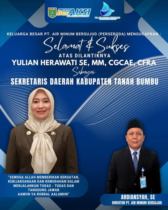 Selamat da Sukses kepada Ibu Yulian Herawati, SE, MM, CGCAE, CFRA atas dilantiknya sebagai Sekretaris Daerah Kabupaten Tanah Bumbu ha tersebut diungkapakan oleh Direktur PT Air Minum Bersujud Ardiansyah S.E.Jumat 22/8/25.