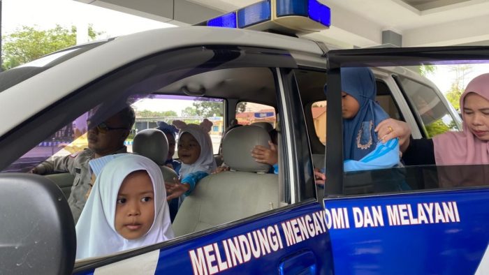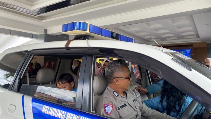 Jalan jalan dengan menaiki mobil Satlantas untuk berkeliling, Selain untuk mengenalka rambu-rambu lalu lintas, baik mulai cara menyeberang jalan dengan aman, hingga pentingnya memakai helm saat naik sepeda motor bersama orang tua.